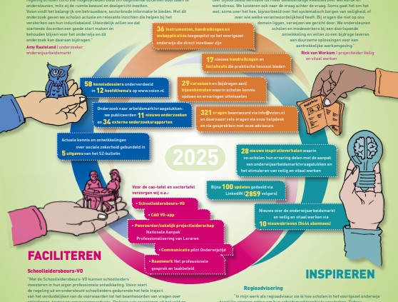 In het jaaroverzicht 2025 geven we een compacte terugblik op onze activiteiten voor het voortgezet onderwijs. Van kennisontwikkeling en onderzoek tot ondersteuning van scholen, inspiratie uit de praktijk en het faciliteren van sectorafspraken. Zo laten we zien hoe we samen met scholen en sociale partners werken aan een aantrekkelijke, veilige en duurzame onderwijsarbeidsmarkt. |